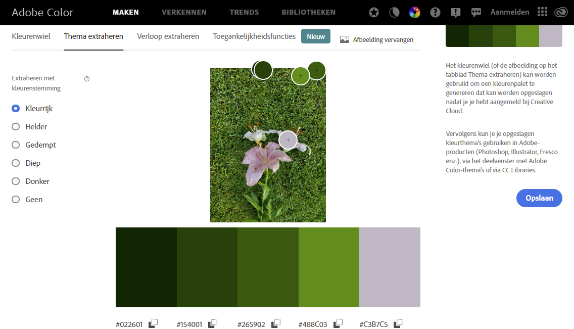 Kleuren kiezen is een kunst op zich, je moet leren welke kleuren bij elkaar passen. 1 gouden tip: kleuren die samen voorkomen in de natuur, passen altijd bij elkaar. Daarom worden er vaak kleurenschema's gemaakt op basis van een foto. De klant ziet dankzij de foto meteen welke sfeer de kleuren oproepen. Je hebt hier geen speciale software of camera voor nodig. Adobe helpt je gratis via color.adobe.com.